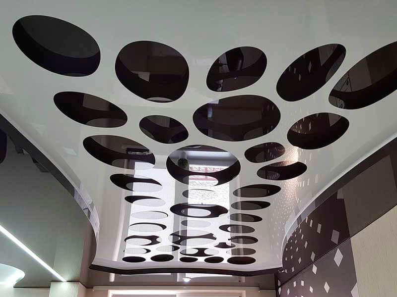 Інший варіант — створення змійки. Це коли основа буде сірою або зеленуватою, а на поверхні полотна розташуються точкові світильники. Різьблене біле полотно стане мати на своїй поверхні смуги з кружечків, які як би переплітаються між світильниками, створюючи подобу повзучої змії.