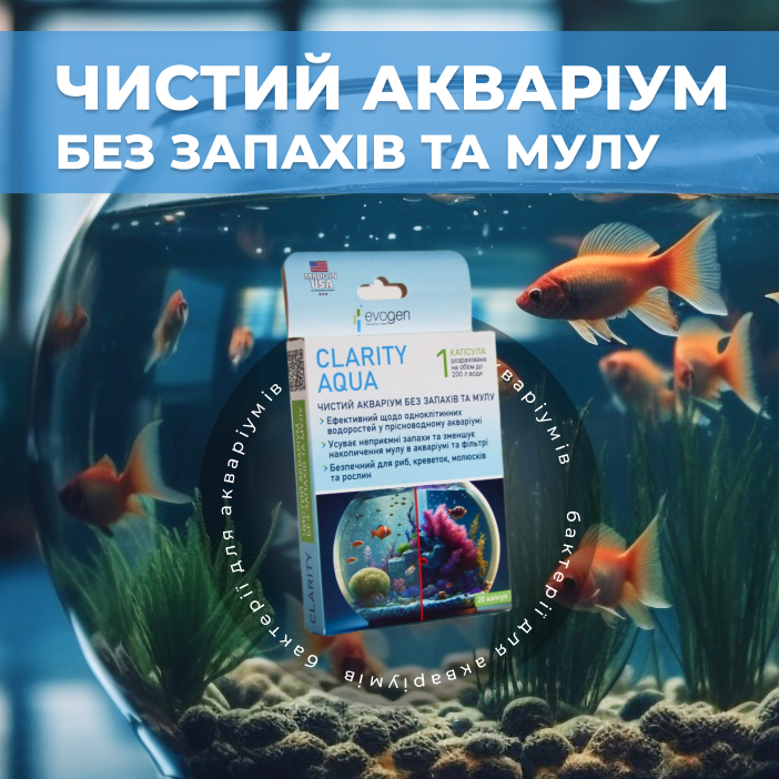 Саме з огляду на важливість бактерій для акваріумного середовища був створений біопрепарат EVOGEN CLARITY AQUA від компанії Step2Clean, який допомагає зберігати баланс в акваріумі шляхом контролю одноклітинних водоростей та знищення мулу.