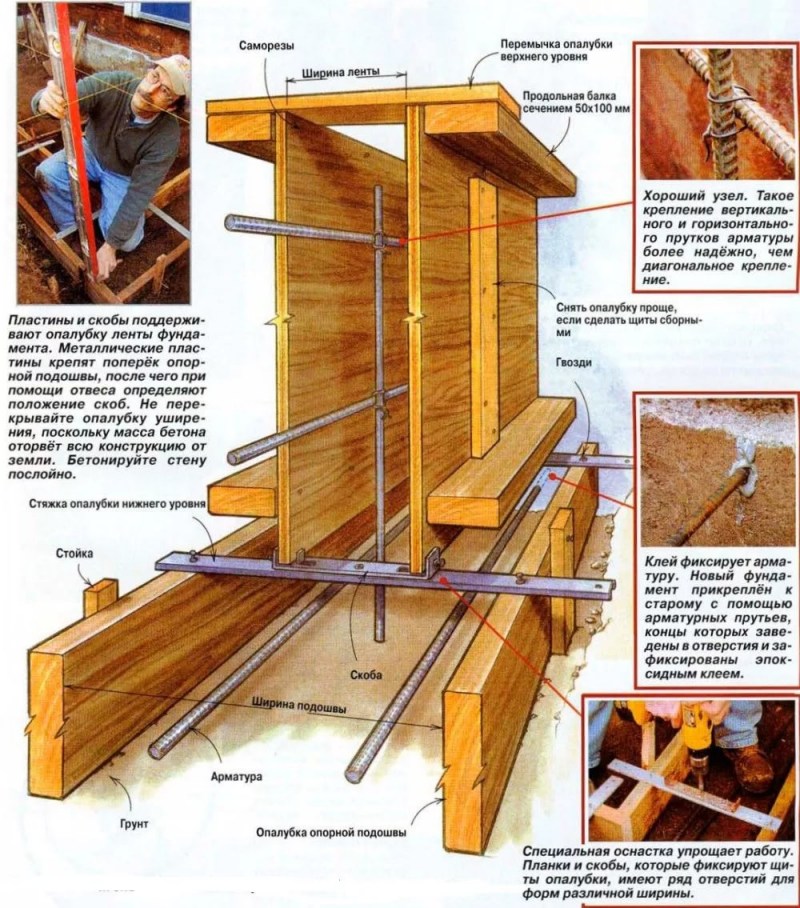 Знімна опалубочная система вважається спрощеним методом роботи. Каркас виконують з дерев’яних брусів, металевих пластин або пінополістирольних блоків. В якості спеціальних кріплень використовуються: